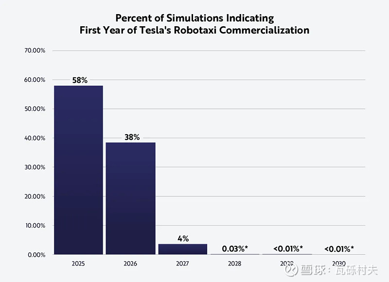 ARK模拟计算得出特斯拉首次推出robotaxi服务的不同年份的概率估算