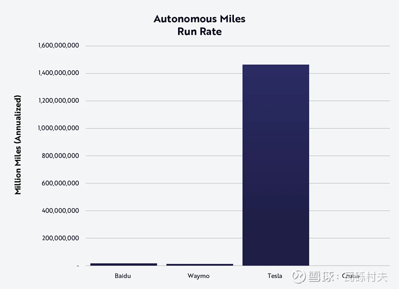 积累驾驶里程的速度,单位:百万英里/每年。百度 vs Waymo vs 特斯拉 vs Cruise