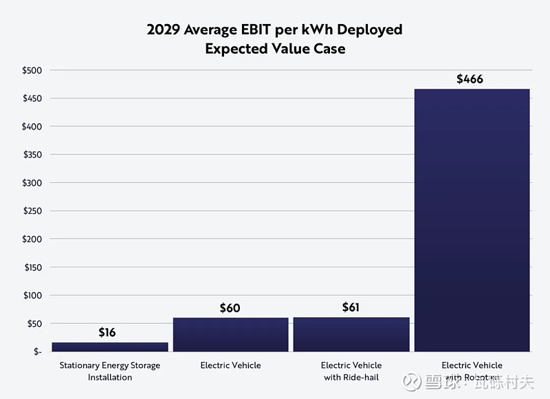 2029年预期价格例子中,平均每千瓦时电池的部署带来的息税前利润(EBIT),固定储能 vs 电动汽车 vs 电动汽车用于出行 vs 电动汽车用于robotaxi