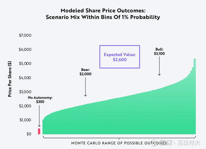 ARK更新后的开源特斯拉模型得出,2029年每股预期价格为2600美元。如下图所示,乐观和悲观的蒙特卡罗模拟结果分别为第75百分位数和第25百分位数,股价分别约为3100美元和2000美元。本研报介绍了ARK的开源特斯拉模型,这个模型结合了45个独立输入的分布,模拟了特斯拉公司及其股票的一系列潜在结果。