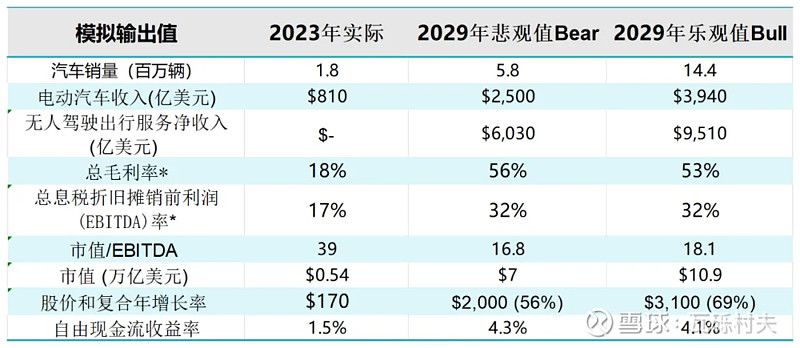 *注:“悲观”和“乐观”示例中,总息税折旧摊销前利润率和总毛利率的相似性反映了我们对两种情况下最合理的经济学观点。在悲观情况下,特斯拉的规模化程度没那么高,可以在较高的价位上维持更长时间,这有利于其利润结构。在乐观情况下,特斯拉电动汽车业务的毛利率和息税折旧摊销前利润率下降,因为它向价格较低的汽车细分市场销售,但能被占利润比例较大的打车业务抵消一部分。