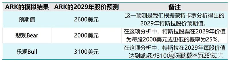 综上所述,ARK的特斯拉目标价格为2029年每股2600美元。我们的悲观和乐观例子表明,2029年特斯拉的估值可能在每股2000美元到3100美元之间。我们已在GitHub上发布了我们的模拟模型,并邀请读者探索和测试假设和/或根据模拟创建可视化效果。