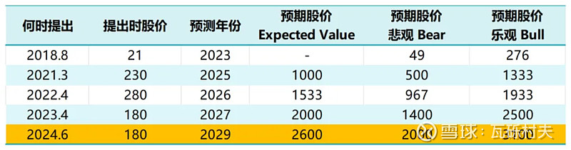 北京时间12日晚,木头姐的方舟投资公司(ARK Invest)公布了最新的$特斯拉(TSLA)$ 目标价及研报,这次依然是一个长线预测——五年之后的2029。我们把木头姐历年对于特斯拉的股价预测整理在一起,方便对比。最后一行是本次的最新预测。