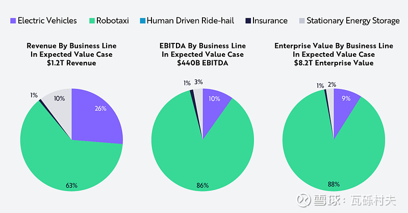 紫:电动汽车;绿:robotaxi;蓝:人工驾驶的出行服务;黑:保险;灰:固定储能