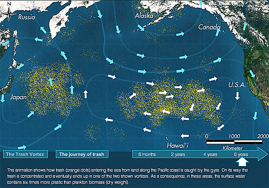 几大洋的洋流圈中心环内漂浮着巨大的塑胶物混合体。太平洋中心地带此区域面积相当于二个德州!