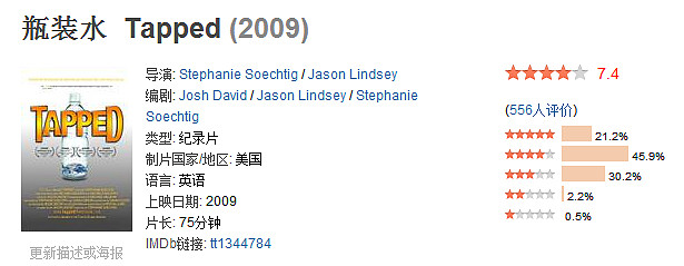 今天看了部纪录片《Tapped (2009)》,本片阐述了美国巨大的瓶装水市场,所带来的环境、生态危害、乃至饮用者本身潜在伤害!
