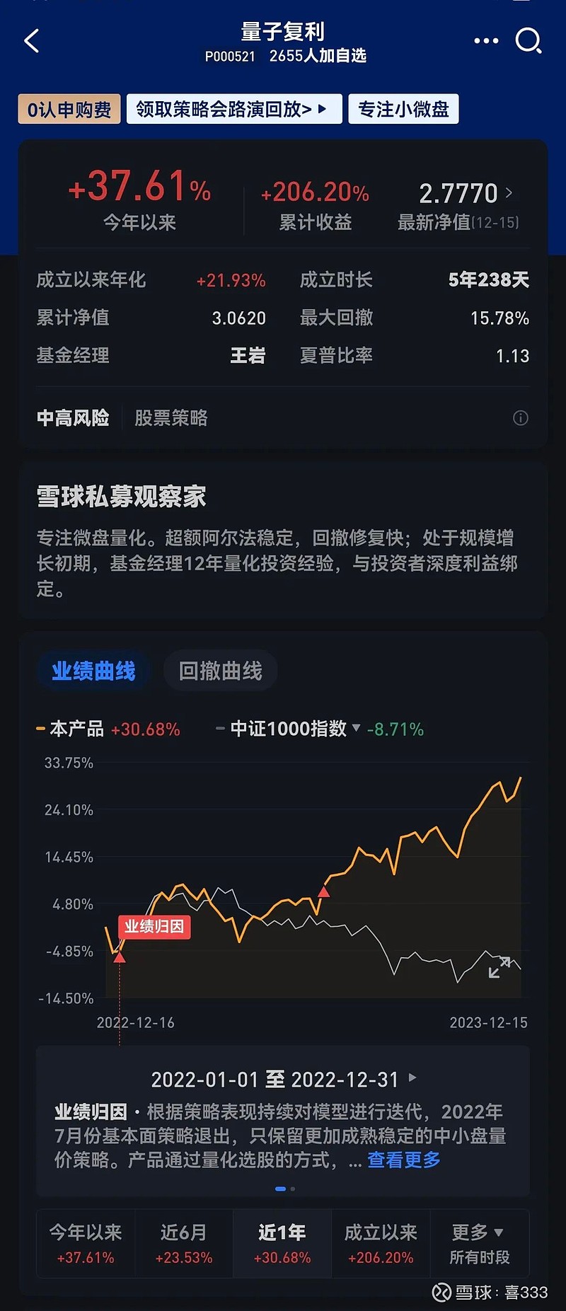 截止12月15号,今年收益37.61%,最大回撤10.83%。2018年4月成立以来,最大回撤15.78%,年化收益21.93%。