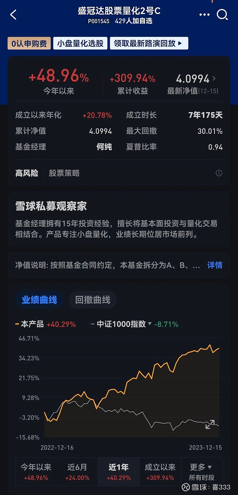 截止12月15号,今年的收益48.96%,最大回撤9.54%。历史最大回撤30%。2016年6月成立以来年化收益20.78%。