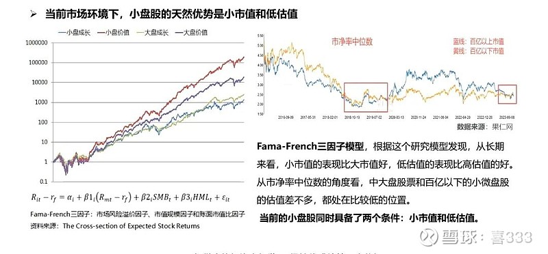 根据法码三因子模型发现,从长期来看,小市值的表现比大市值好,低估值的表现比高估值好。从市净率中位数角度看,中大盘股票和百亿以下的小微盘股的估值差不多,都处于比较低的位置。