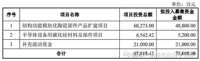 近期,珂玛科技发布公告称,公司拟向不特定对象发行可转换公司债券,拟募集资金总额不超过7.5亿元,将全部投资于以下项目:结构功能模块化陶瓷部件产品扩建项目、半导体设备用碳化硅材料及部件项目及补充流动资金。