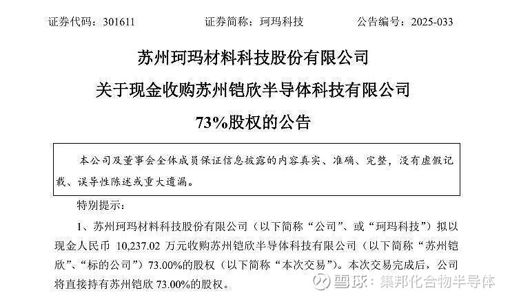 此外,7月22日,珂玛科技拟以1.02亿元现金收购苏州铠欣73%的股权。苏州铠欣在CVD碳化硅陶瓷零部件领域技术深厚,其产品已在Si外延、SiC外延、GaN外延等多个领域实现规模化应用,碳化硅刻蚀环、碳化硅喷淋头、12英寸Si外延用碳化硅涂层石墨基座等先进产品的开发也取得了良好进展。