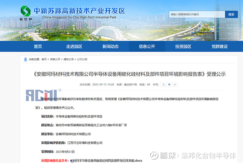 市场最新消息显示,珂玛科技半导体设备用碳化硅陶瓷部件的扩建项目获最新进展。9月15日,滁州市人民政府发布了关于《安徽珂玛材料技术有限公司半导体设备用碳化硅材料及部件项目环境影响报告表》受理公示。
