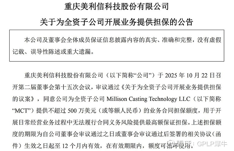 美利信还发布公告称,其为全资子公司Millison Casting Technology LLC提供不超过500万美元(或等额人民币)的业务合同担保额度,用于开展日常经营业务过程中无法履行合同义务风险提供最高额保证担保。@今日话题