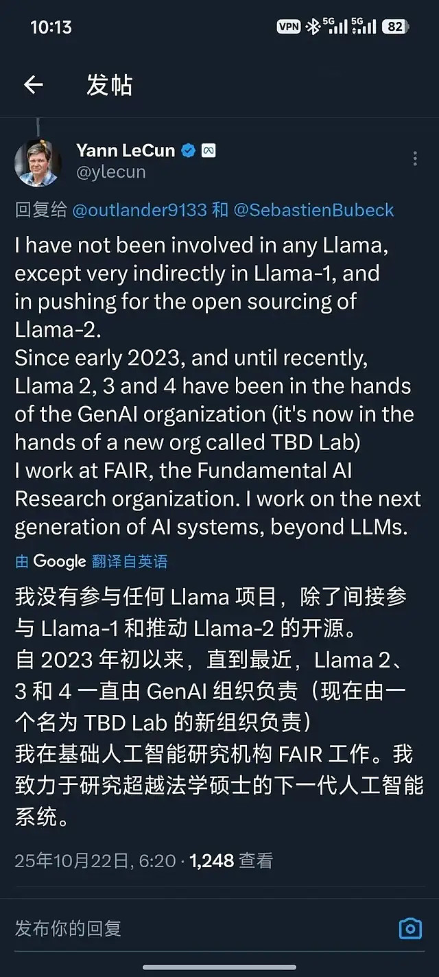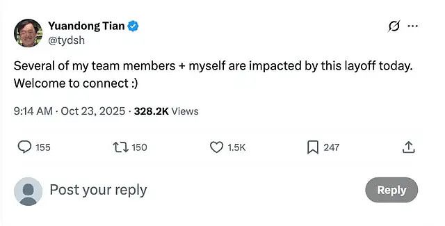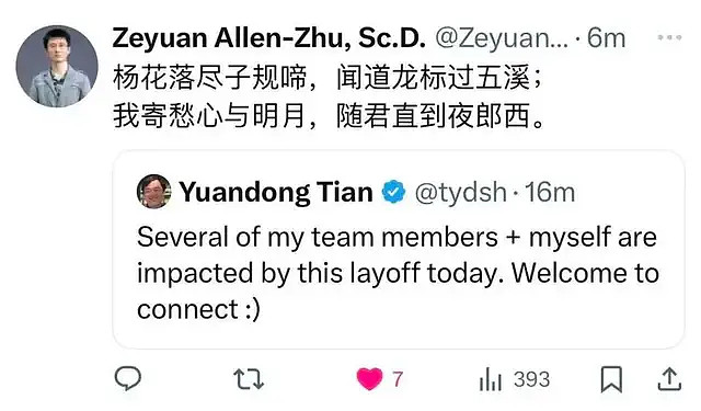 资深研究员田渊栋在社交媒体X上证实:“我和我的部分团队成员今天受到裁员影响。”作为Meta FAIR团队前负责人,田渊栋是MSL的重要科研支柱之一。他的离职标志着Meta最具学术影响力的AI科学家之一正式离开公司。