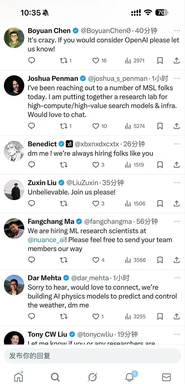 在田渊栋宣布离职的帖子下,OpenAI、XAI、Anthropic等头部AI公司纷纷抛出橄榄枝。这种公开“抢人”现象,在传统的科技行业裁员中并不常见,凸显了顶尖AI研究人员的稀缺性和价值。