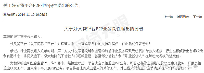 网贷天眼讯 11月19日,广州P2P平台“好又贷”发布公告称,平台决定退出P2P业务,即日起停止网络借贷信息中介业务,开展良性退出收尾工作,且未来不再开展P2P业务。此外,根据平台的兑付方案显示,平台将按照确权金额在15个工作日内,通过债权转让的方式一次性完成兑付。
