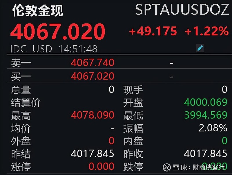 股市下跌,资金需要避险,去哪避险?大家首先想到的肯定又是黄金了,所以黄金前几天成功拿下4000美元关键关口之后,又毫不费劲地在今天创出历史新高。