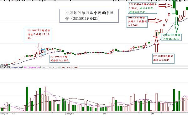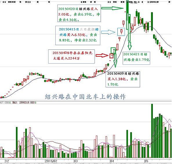 并且绍兴路在4月15日和4月20日的两只个股累计资金操作都超过10亿规模,其中4月15日绍兴路在中国北车上卖出8.85亿,并且买入6.65亿,在中国南车上买入3.36亿,总计买入金额达10.01亿。