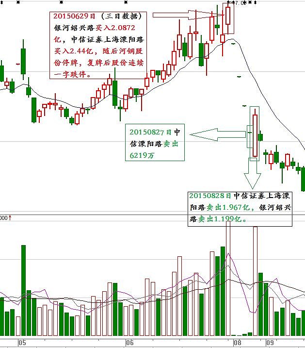 解读:期间,市场对钢铁股炒作升温,赵老哥银河绍兴席位介入2.0872亿,而大游资孙煜中信溧阳路介入2.44亿,随后河钢股份重大事项停牌,在停牌期间股市大跌,河钢股份复牌以后,两大游资割肉出逃,赵老哥亏损8882万,而孙煜按照河钢股份停牌价计算6.97元/股计算,介入4.24亿,而卖出只有2.59亿,亏损达1.65亿。