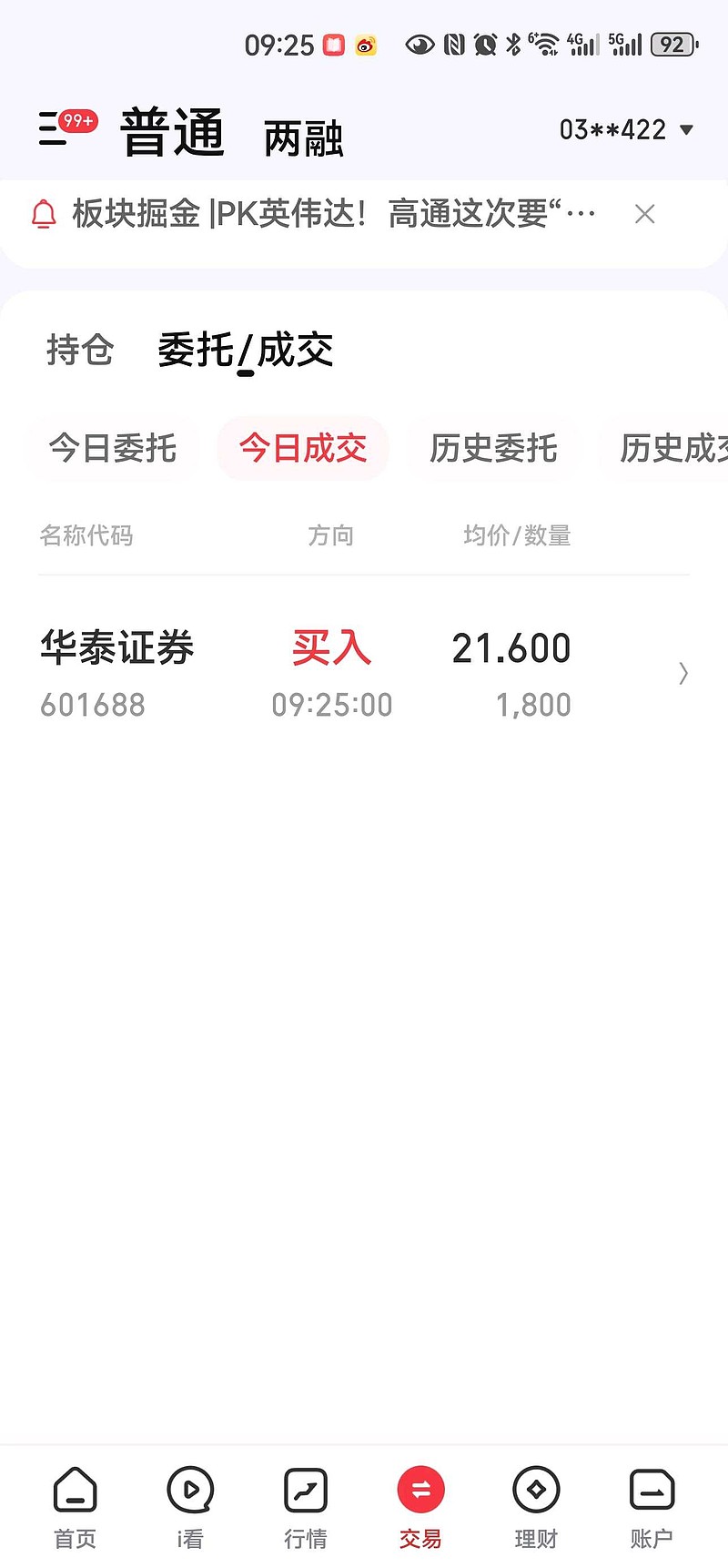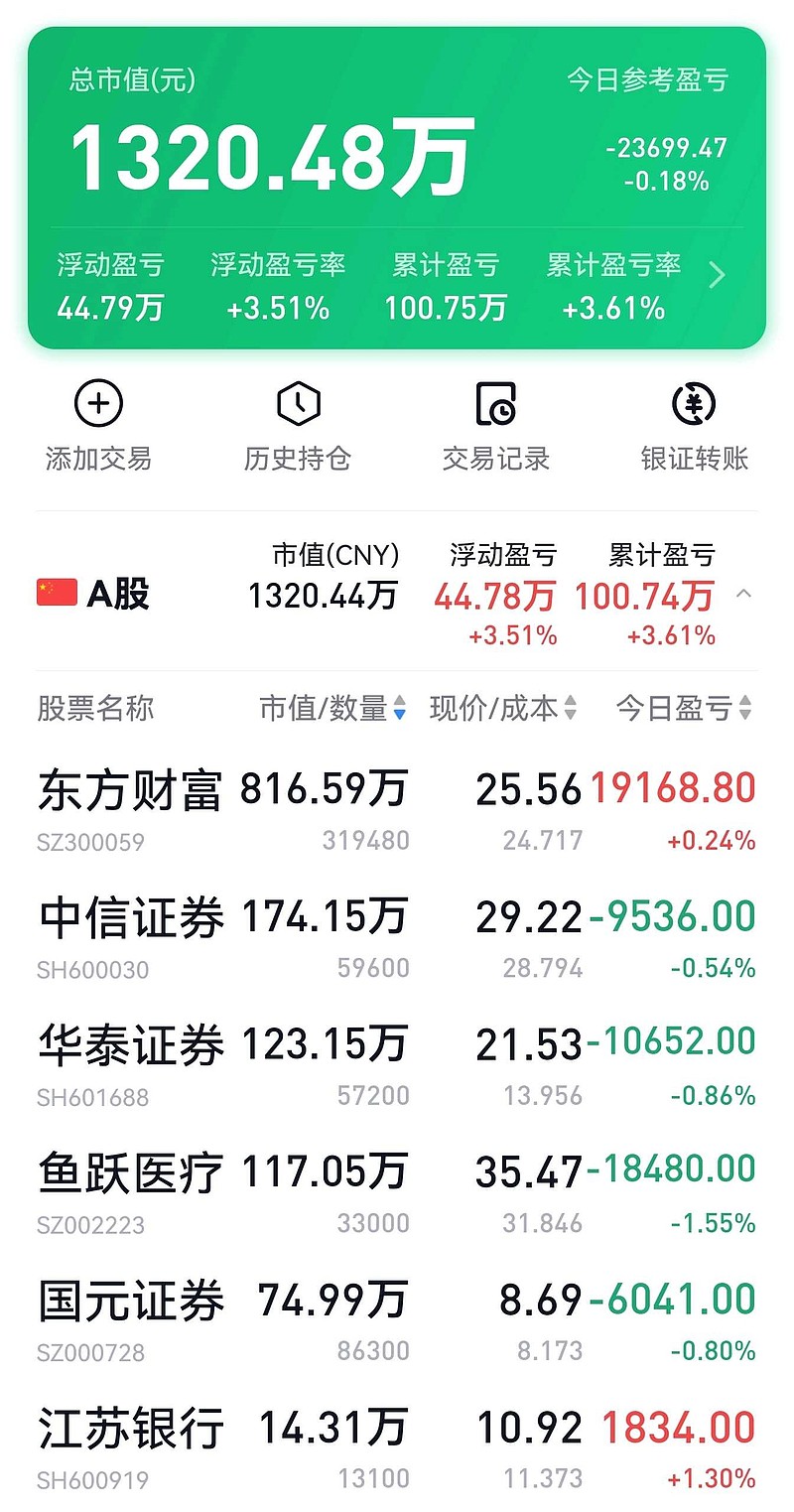 今天开盘集合竞价加了一笔华泰证券,券商业绩没啥可担心的,坚信未来几年A股一定会迎来牛市,投资就是赌国运,哪怕赌输也认了。坚定不移看好券商,目前大部分券商的估值普遍都不高,业绩增长的确定性却很高,股价上涨是早晚的事情。牛市不满仓,两眼泪汪汪!$东方财富(SZ300059)$ $华泰证券(SH601688)$上证指数(SH000001)$