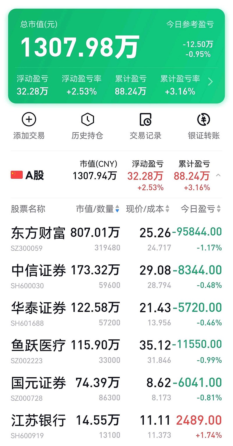 今日无操作,虽然券商今天继续下跌,但应该没有太大下跌空间了,有钱可以继续加仓。坚定不移看好券商,目前大部分券商的估值普遍都不高,业绩增长的确定性却很高,股价上涨是早晚的事情。牛市不满仓,两眼泪汪汪!$东方财富(SZ300059)$ $华泰证券(SH601688)$上证指数(SH000001)$