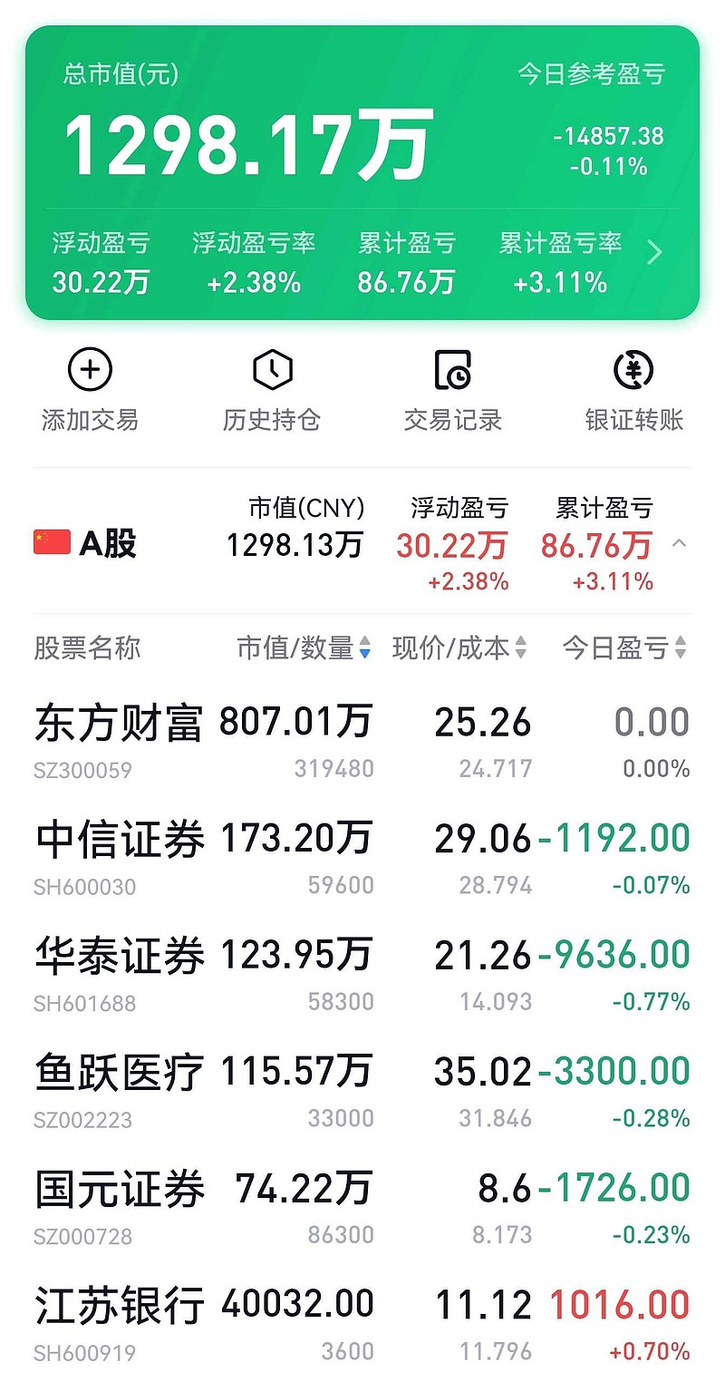 今天卖出江苏银行减了点融资,加了点华泰证券,目前位置券商可以放心大胆买入。坚定不移看好券商,目前大部分券商的估值普遍都不高,业绩增长的确定性却很高,股价上涨是早晚的事情。牛市不满仓,两眼泪汪汪!$东方财富(SZ300059)$ $华泰证券(SH601688)$上证指数(SH000001)$