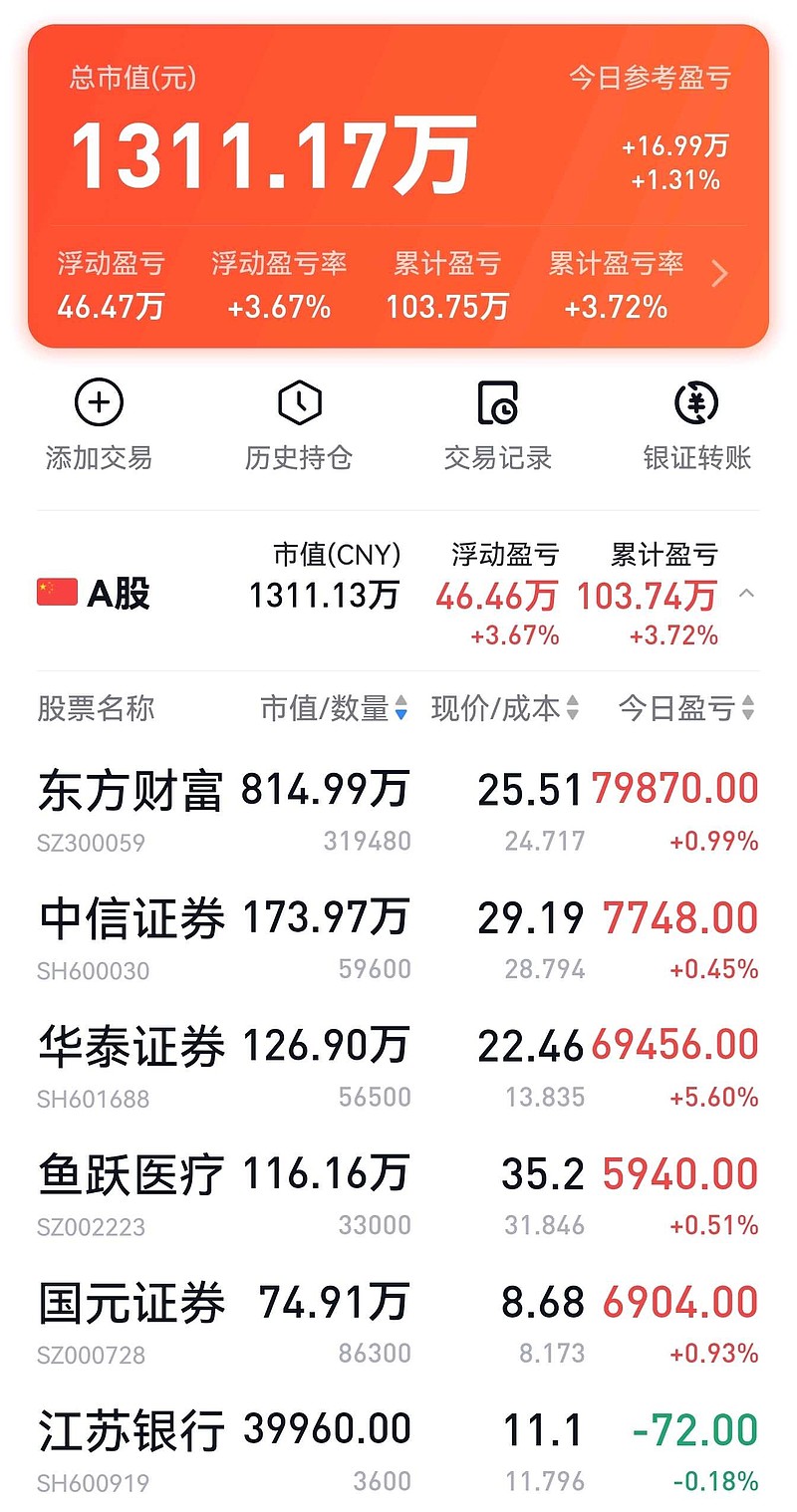 今天赚17万,涨1.31个百分点,跑赢大盘0.34个百分点,今年赚103.7万(未扣除融资利息),目前总持仓市值1311.1万。