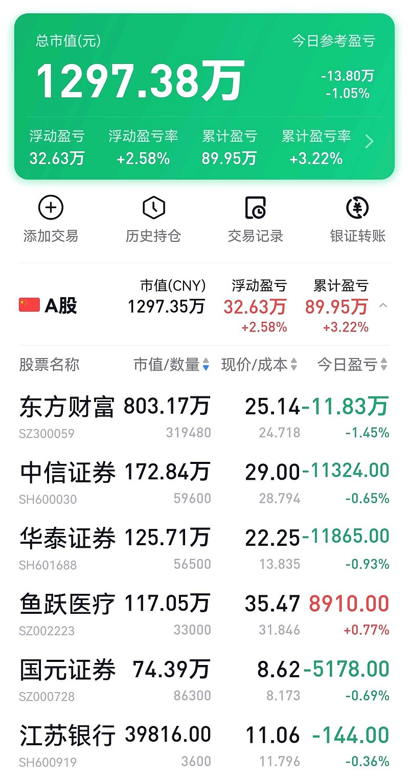 今日无操作,昨天赚的今天基本上又全部还了回去,简直太折磨人了,慢慢熬吧。坚定不移看好券商,目前大部分券商的估值普遍都不高,业绩增长的确定性却很高,股价上涨是早晚的事情。牛市不满仓,两眼泪汪汪!$东方财富(SZ300059)$ $华泰证券(SH601688)$上证指数(SH000001)$