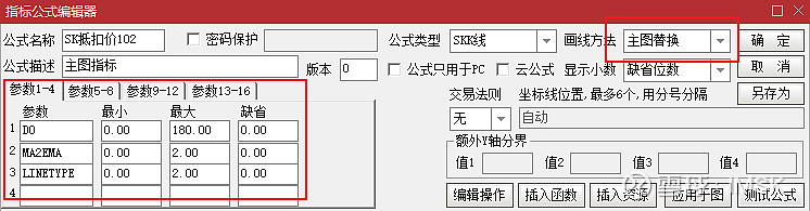 在“指标公式编辑器”中设置,由于本公式为主图使用,而且不使用系统默认的K线图,因此设置为“主图替换”。