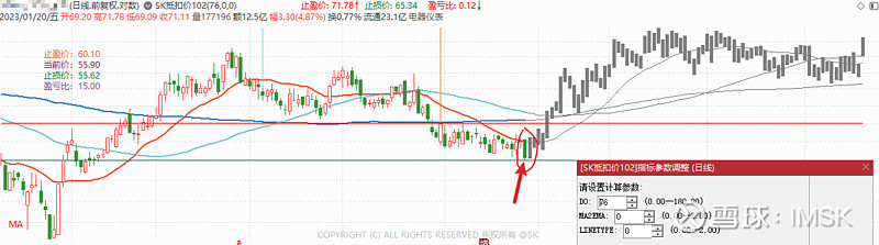 选择这个位置的原因是“20抵扣价”在这个位置上和收盘价接近同一水平线,而且“20抵扣价”为持续下行,符合“多头有利”的状态。