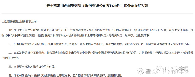 近日,中国证监会官网披露消息显示,山西省安装集团股份有限公司发行境外上市外资股申请已获证监会核准批复,核准山西安装集团发行不超过38333.4万股境外上市外资股,并赴香港联合交易所主板上市,此举意味着这家山西最大专业工业工程承包商成功拿到赴港上市“大路条 ”。