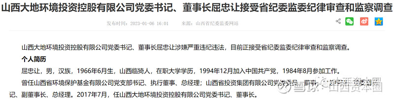 1月6日,山西纪委监委官网披露重磅消息称,山西大地环境投资控股有限公司党委书记、董事长屈忠让,副总经理傅垣洪均因涉嫌严重违纪违法,目前正接受省纪委监委纪律审查和监察调查。
