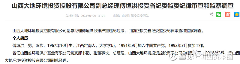 而此次同时被查的傅垣洪,亦曾有省环境保护基金公司任职经历,曾任山西省环境保护基金公司党支部书记、副董事长、总经理,后随着山西大地控股挂牌组建,改任大地控股总经理助理,后于2018年8月任山西大地控股副总经理。