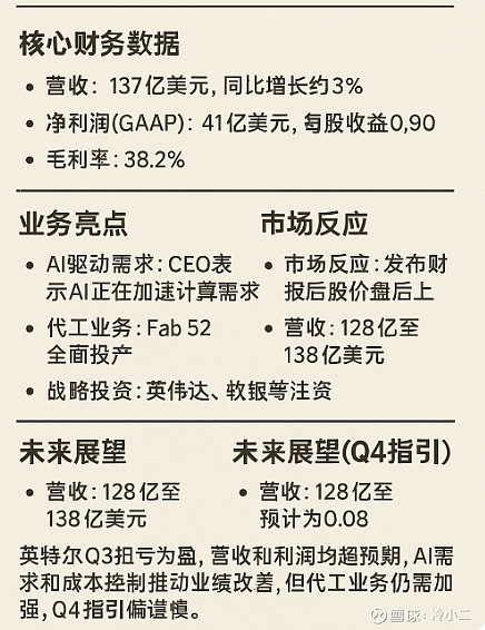 营收:128亿至138亿美元(略低于市场预期中值)。 调整后EPS:预计\$0.08,符合市场预。 趋势:管理层预计“当前需求超过供应”,这一趋势可能持续到2026年。✅ 一句话总结:英特尔Q3扭亏为盈,营收和利润均超预期,AI需求和成本控制推动业绩改善,但代工业务仍需加强,Q4指引偏谨慎。