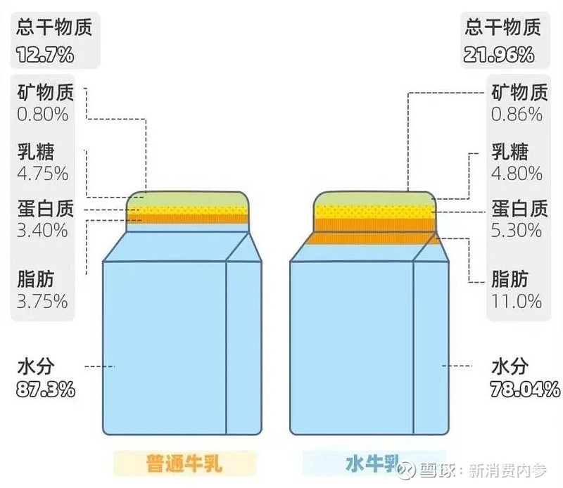 一来纯水牛奶成本高、继而定价会更高,为高价水牛奶买单的消费者也少;二来纯水牛奶乳脂含量过高,勾兑普通牛奶可调节营养配比,口感上也更去腻留香。