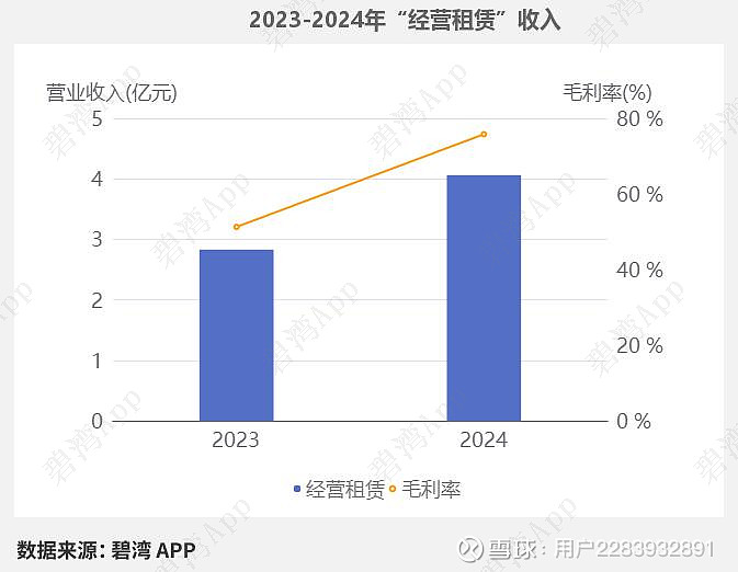 2024年经营租赁营收4.06亿元,同比去年的2.83亿元大幅增长了43.34%。同期,2024年经营租赁毛利率为75.8%,同比去年的51.27%大幅增长了47.84%。