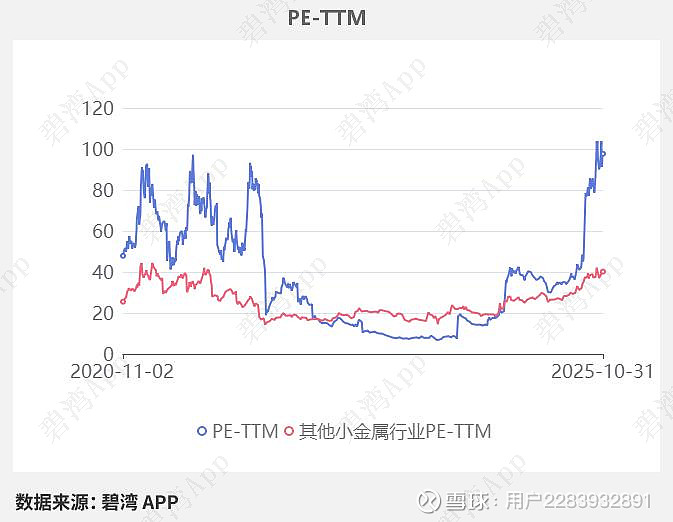 在2025年10月31日,中矿资源的PE-TTM是97.69,而其他小金属行业的PE-TTM是40.20,中矿资源的PE-TTM远高于其他小金属行业的PE-TTM。
