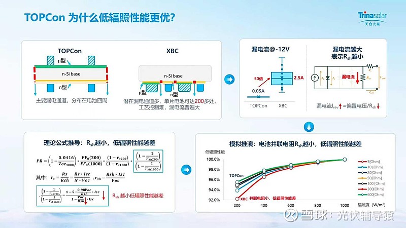 A:BC结构电极均在背面,材料和工艺无法实现很好的正负极绝缘,存在过热风险。BC厂家为解决此问题,增加大量特意设计的漏电通道(数量为TOPCon的数十倍),虽然可缓解反向电压影响,但是导致漏电大幅增加。在低辐照情况下,电池需要更多能量才能发电,导致弱光能力差。