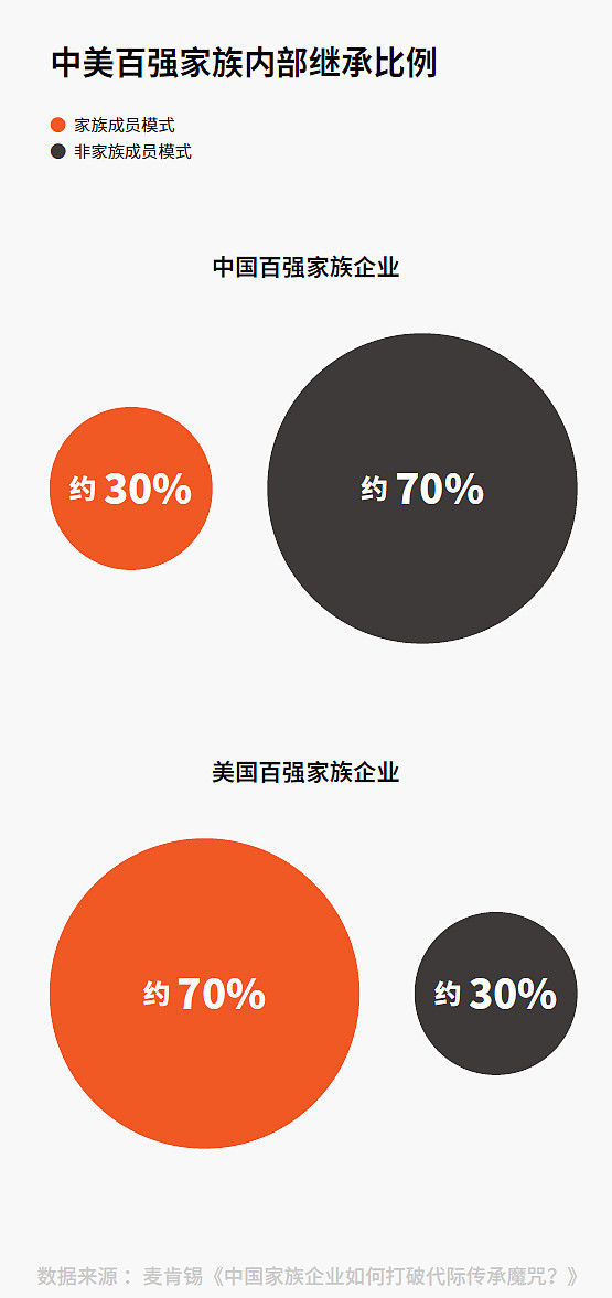 据《2024 胡润百富榜》数据显示,近80% 上榜企业家年龄超过50岁,传承问题近在眼前。中国百强家族企业中,来自内部的接班人的选任比例仅为30% 左右,不足美国百强家族企业的一半。究其根本,是中国家族企业创始人对下一代信任不足,认为他们尚不具备接任家族企业经营和资产管理的能力。因此,他们不敢也不愿将传承大任“交棒”给家族后代。此外,不少后代成员也确实存在意愿不足或是能力欠佳等客观问题,无法顺利接任家族企业决策层职位。