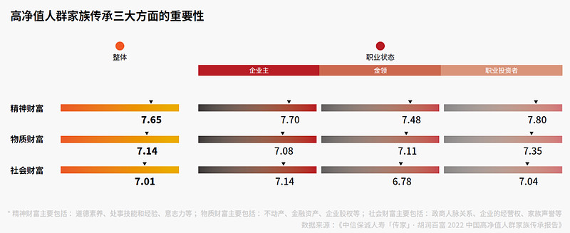 在关涉家族传承的三大领域(物质财富、社会财富、精神财富),中国的高净值人群认为精神财富的重要性居首(平均7.65 分,10 分制),物质财富其次(平均7.14 分,10 分制),社会财富最后(平均7.01 分,10 分制)。其中,职业投资者对物质财富的关注度(平均7.35 分,10 分制)高于企业主(平均7.08 分,10 分制)和金领(平均7.11 分,10 分制),而企业主对社会财富的关注度相对较高(平均7.14 分,10 分制)。