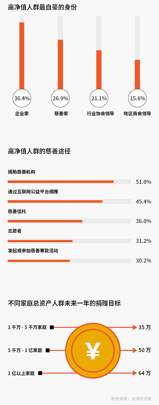 根据《2024 胡润至尚优品》,企业家(36.4%)是高净值人群最自豪的身份, 其次是慈善家(26.9%)。高净值人群最青睐的慈善途径是“捐助慈善机构”,其次是“通过互联网公益平台捐赠”和“慈善信托”。整体趋势来看,高净值人群对于未来的捐赠目标为40 万,其中,家庭总资产在1千万至5 千万的人群未来一年的平均捐赠目标为35万,家庭总资产在5 千万至1 亿的人群未来一年的平均捐赠目标为50 万,超高净值人群的平均捐赠目标为64 万。