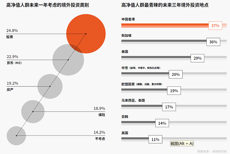 据《2024 胡润至尚优品》调研显示,86% 的高净值人群未来一年考虑境外投资。境外资产占可投资资产的比例平均为16%。股票和货币(外汇)成为主要投资类别,总占比接近五成(48%),其次是房产和保险,分别占比19.2% 和18.9%。