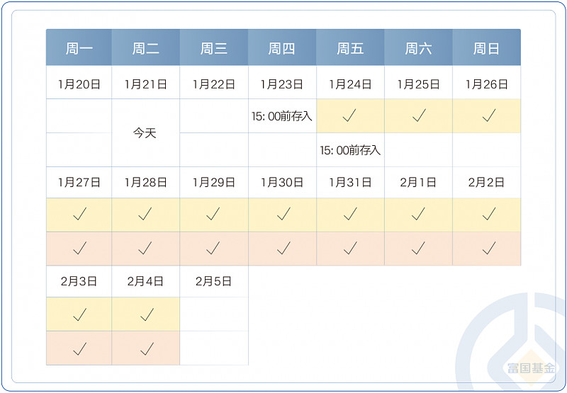 一般来说,T日15:00前存入货币基金,则T+1日即可确认份额,并开始计算收益。因此,如果在1月24日(本周五)的15:00前将资金存入货币基金,将于1月27日确认份额,连续9天获得收益;如果在1月23日(本周四)的15:00前存入,那么将于1月24日确认份额,24至26日间也会有收益,最终将连续12天获得收益。