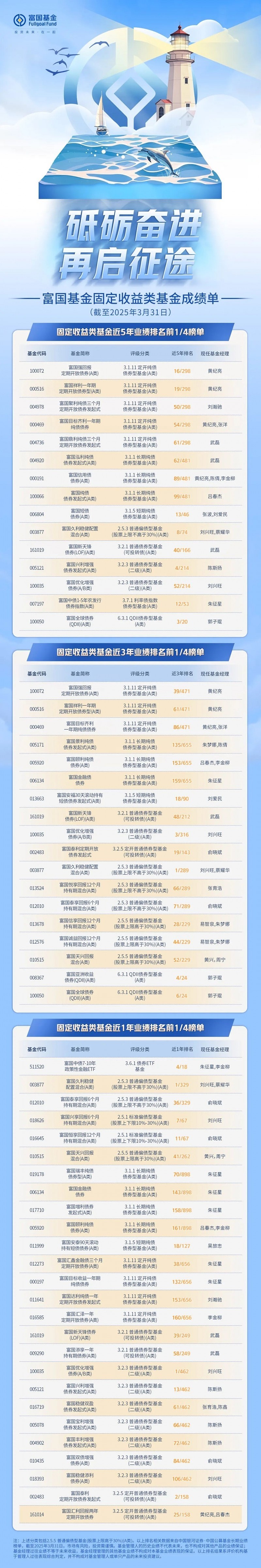 银河证券数据显示,截至3月31日,富国基金旗下26只固收类基金近一年进入同类前1/4,近三年共有18只进入同类前1/4,近五年共有15只进入同类前1/4。
