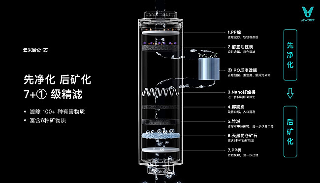 云米昆仑芯是云米昆仑4Pro弱碱矿泉净水器的核心部件,先净化,后矿化,采用7+①级精滤,既可以实现滤除100多种有害物质,又使水中富含锶、钠、镁、钾、钙、偏硅酸六种有益矿物元素,更关键是出水呈弱碱性,口感更好,接近知名矿泉水,尤其适合泡茶、烹饪、婴幼儿冲奶粉等场景,更有益健康。
