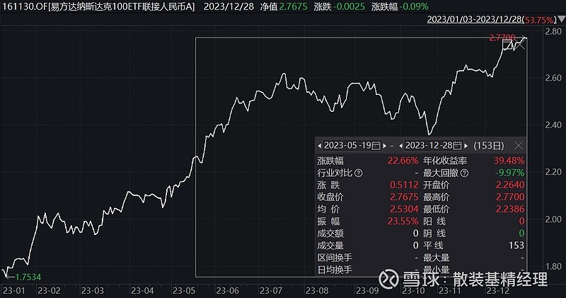 我自5月底开始持有易方达纳斯达克100ETF联接人民币A(161130),截至2023年12月28日收盘(QDII延后公布净值数据,所以当下拉不到12月29日A股最后一个交易日的数据),持有收益率23%。