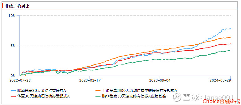 3只基金从2022-06-28到2024.3.31,涨幅第一的是鹏华稳泰30天的7.8%,涨幅第2的是上银慧享利30天的6.39%,涨幅第3的是华夏30天滚动的5.3%,3只基金都跑赢业绩基准。(从上银慧享利30天基金成立的2022-06-28开始算起,业绩基准为中债总财富(1-3年)指数收益率*80%+一年期定期存款利率(税后)*20%,华夏30天滚动的业绩基准为中债综合财富(1年以下)指数收益率*85%+一年期定期存款利率(税后)*15%,为了分布2比较,我统一选择中债总财富(1-3年)指数收益率*80%+一年期定期存款利率(税后)*20%。)