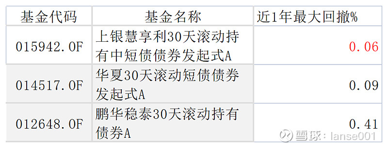近1年最大回撤:从低到高分别为:上银慧享利30天滚动为0.06%,华夏30天为0.09%,鹏华稳泰30天为0.41%。