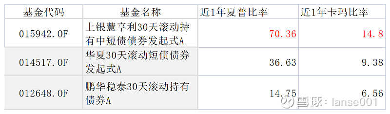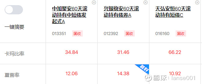 从近1年卡玛比率来看,从高到低的是天弘安恒60天的66.22,中加聚安60天的34.84,兴银稳安60天的31.46.