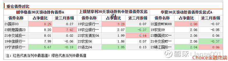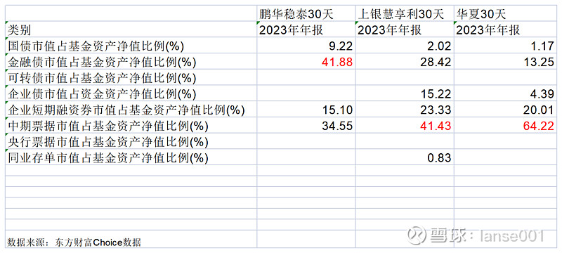 从券种配置来看:中期票据、企业短期融资券、金融债是3只基金前3大持仓,但各个基金的持仓有一定的差异,鹏华稳泰30天第一大持仓是金融债,上银慧享利30天和华夏30天第一大持仓是中期票据。(3只基金都是纯债基金,不持有可转债。)